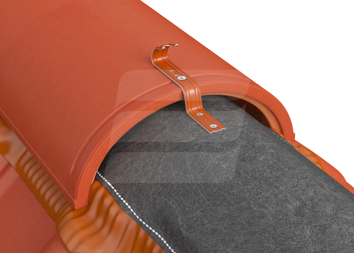 Используется для монтажа хребта (конька) к коньковому брусу. Крепится одним саморезом к коньковому брусу и цепляется за верхнюю часть к хребту. Обеспечивает надежный монтаж конька и повышает его устойчивость к при сильном ветре. Ее структура и профиль позволяют применять скобу к большинству бетонных черепиц на рынке.